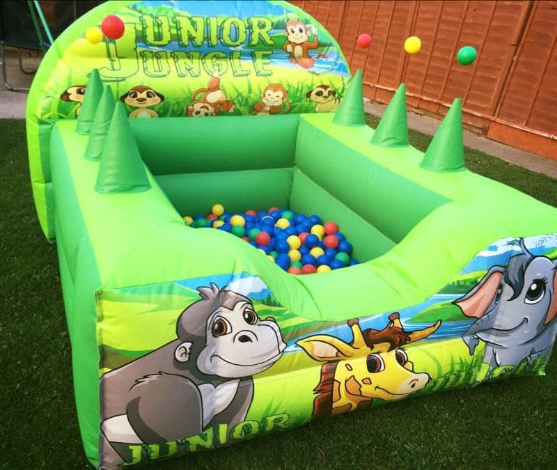 This ball pool is a fantastic, the rounded wall on this inflatable stands at only 5ft which makes it very easy for parents to get their children in and out of the pit. Bright colours and amazing art work will keep children entertained for hours. The balls float in mid air over the air jugglers.